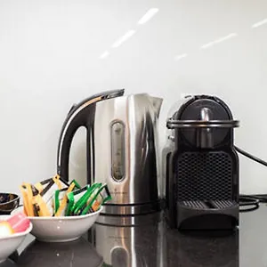 Den Gästen stehen ein Wasserkocher, ein Kühlschrank und ein Herd zur Verfügung.